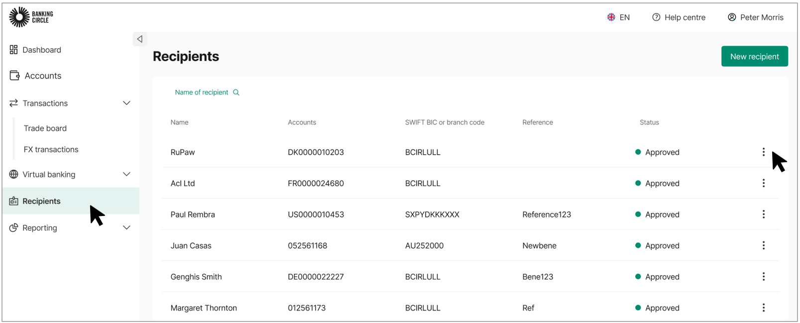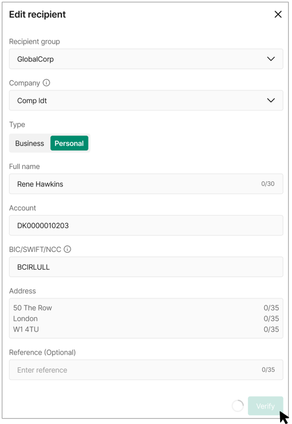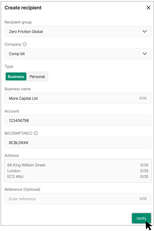 - Once all the required fields are completed, click Save to create the new recipient or Verify to check the name and account number match.