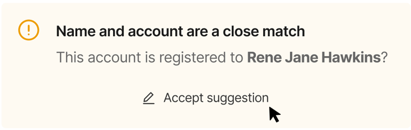 - Close match: The details are similar but not exact (e.g., a minor typo, type). Use the suggested name and account details before proceeding and/or contact the recipient to confirm.