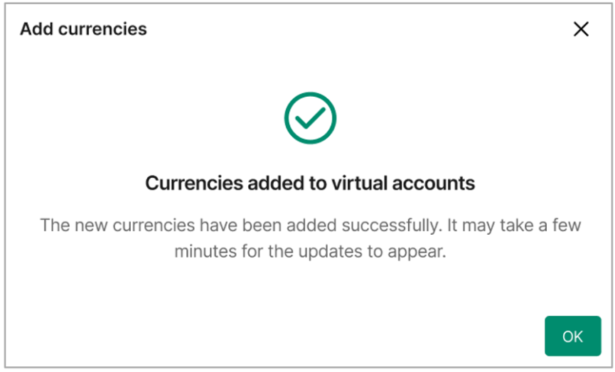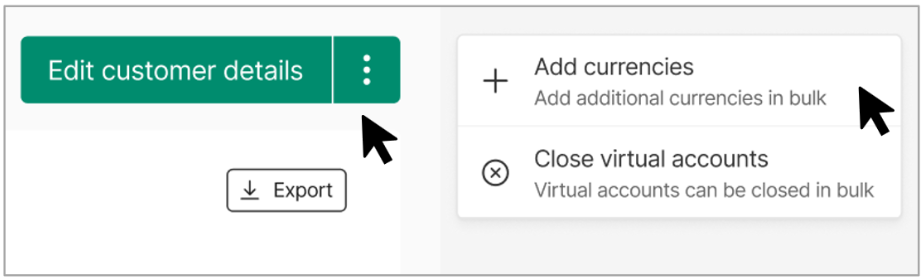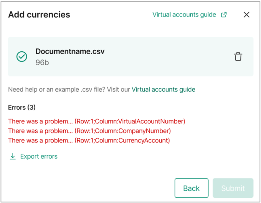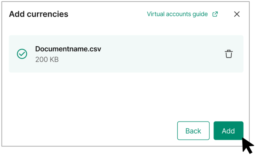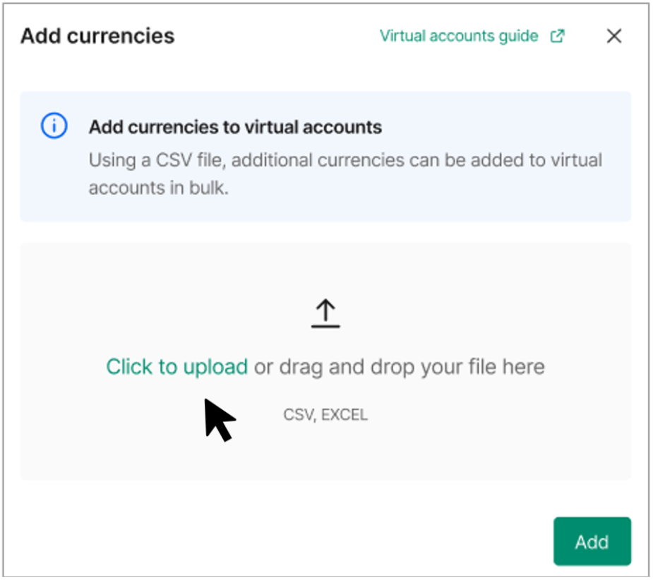 This functionality allows you to add currencies to Virtual Accounts in bulk by uploading a CSV file. The update is processed in bulk and applies only to Virtual Accounts.