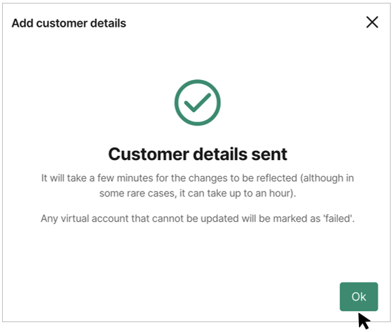 - Failed - The Virtual Account’s Customer Details could not be updated due to an error. Please get in touch with Client Service.