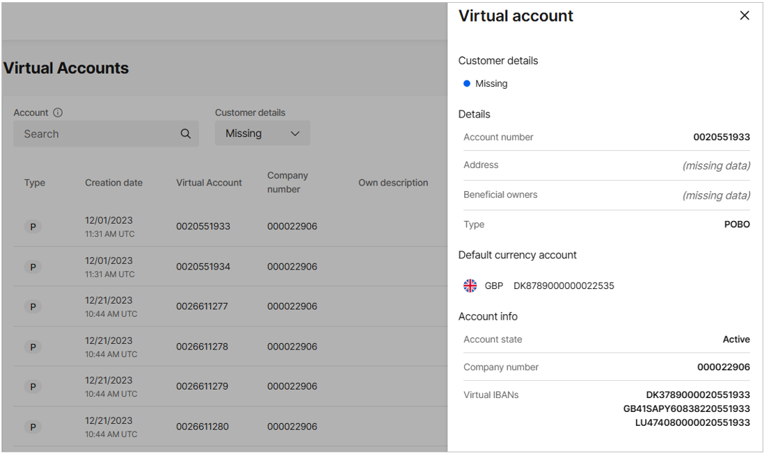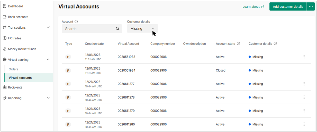 - Find the Virtual Accounts missing the customer details information via the "Missing" filter on the page, giving you all the Virtual Accounts where the customer details and Ultimate Beneficiary Owner (UBO) information is missing: