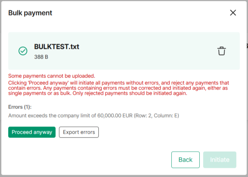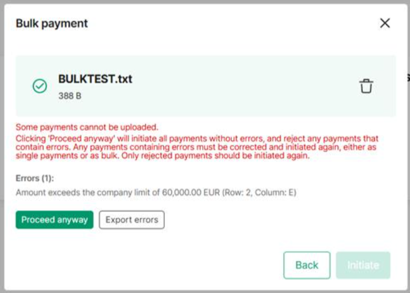 - The file can be uploaded but payments exceeding the limit will be rejected and appear as rejected on the Transactions list