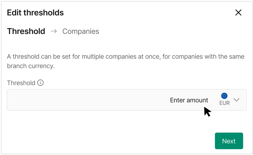 - Enter the new threshold amount. The currency is set automatically based on the branch base currency.