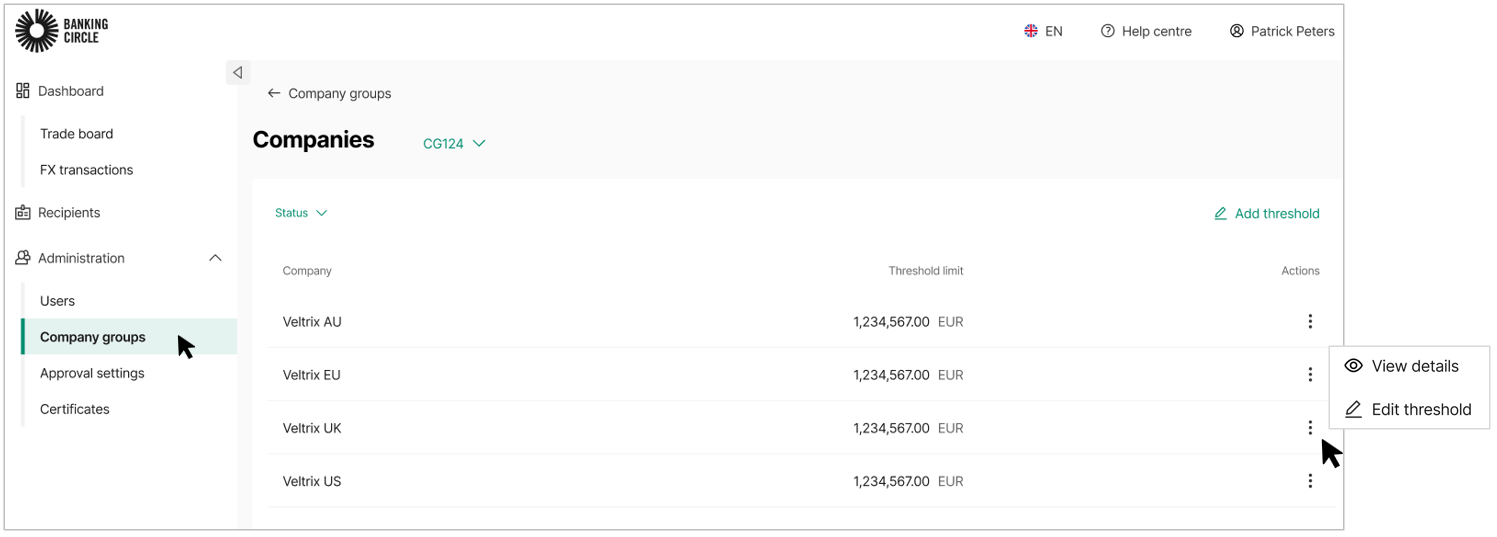 - Select the three-dots menu next to the company and click Edit threshold.