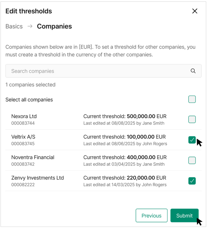 - Select one or more companies from the list. You can apply the same threshold to multiple companies at once, provided they share the same branch currency.