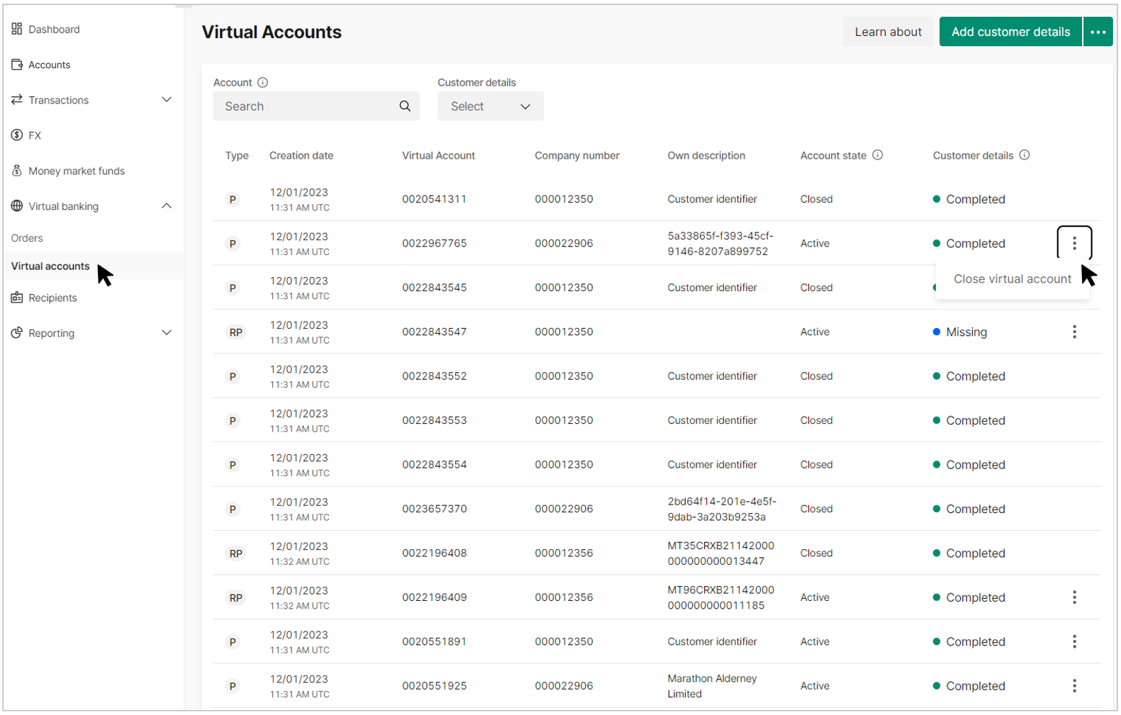 Before you start, ensure that you have been assigned the ‘Order and update virtual accounts’ permission. You can initiate a virtual account closure from the Virtual accounts section.