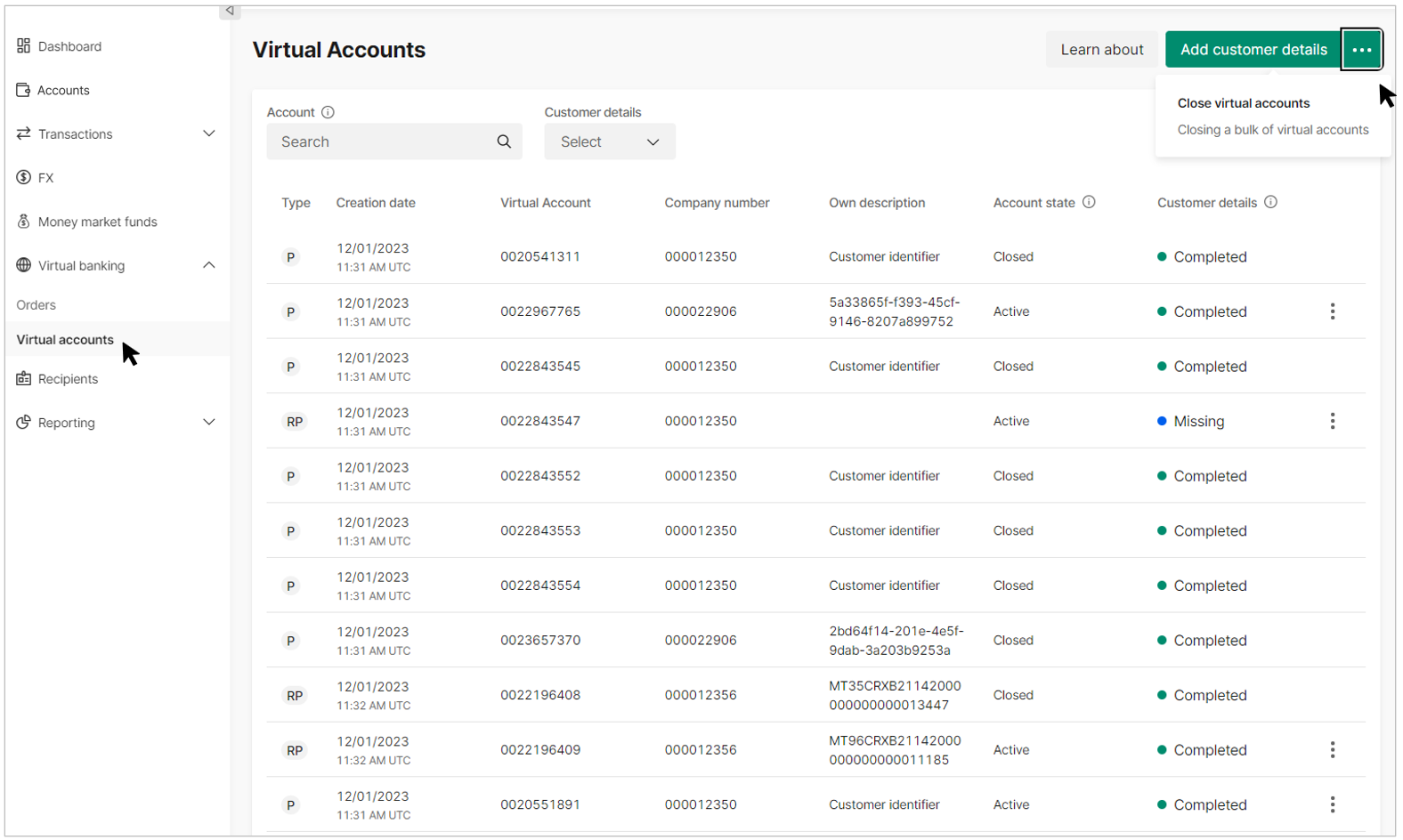Virtual accounts can be closed by users who have permission to ‘Order and update virtual accounts’. This article describes how to close virtual accounts via the Client Portal.