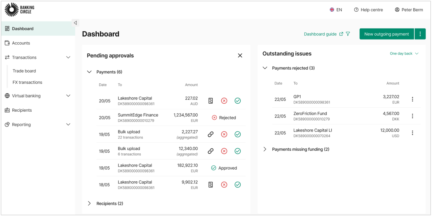 The Dashboard provides a high-level view of all Pending Approvals and Outstanding Issues related to payments and transactions. This is the main hub where you can take action on approvals or resolve any issues within your payment workflows.