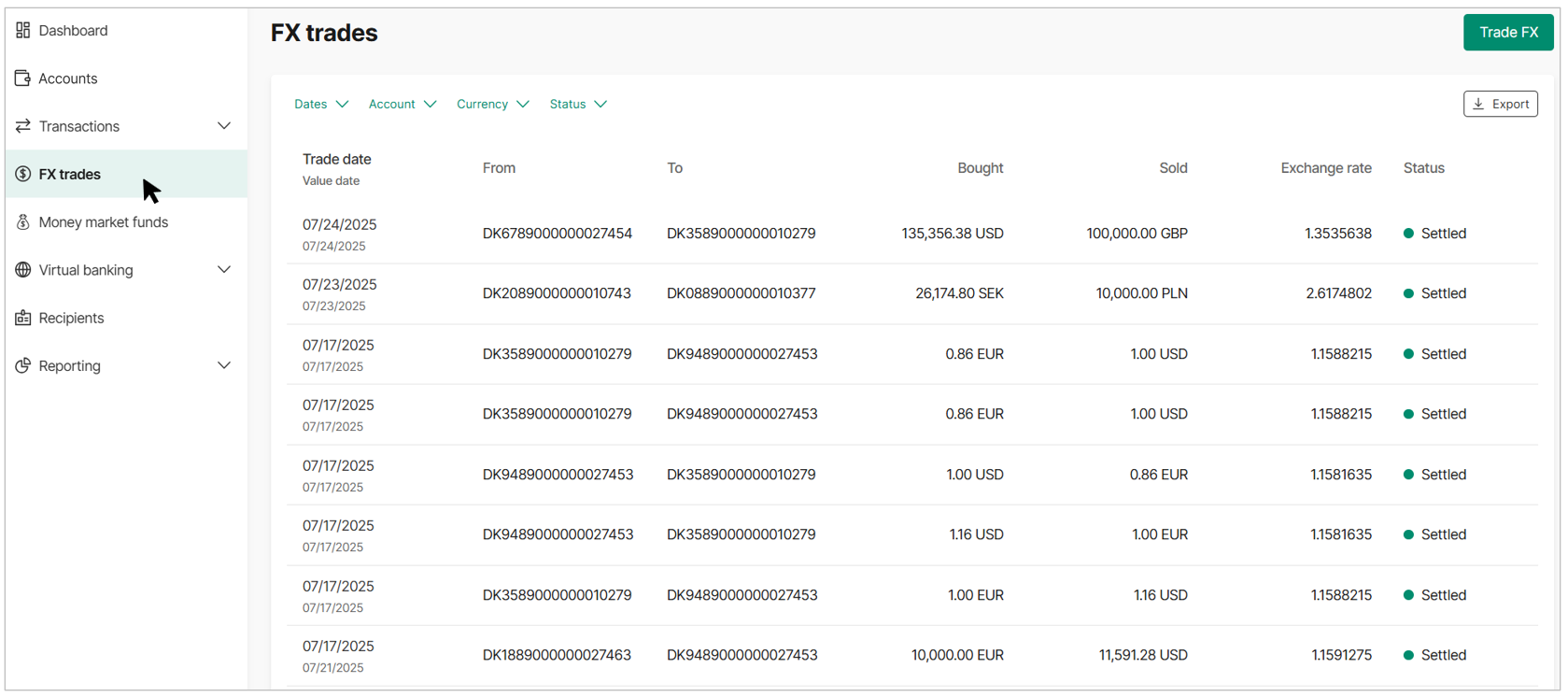 - Click the Export button to download the FX data as a .csv file, which can be used for reporting or record-keeping.