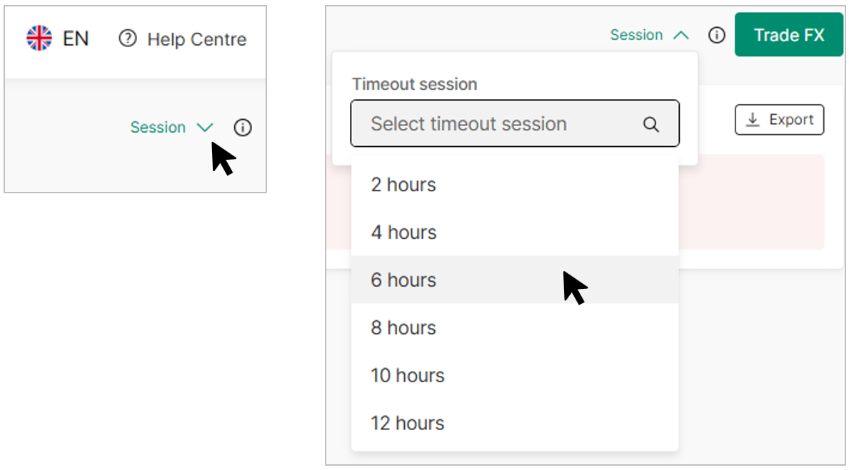 This allows FX users to choose how long their FX session remains active, reducing the need to log in again after inactivity. It applies only when the user is on one of the FX pages: Transactions or Trade Board.
