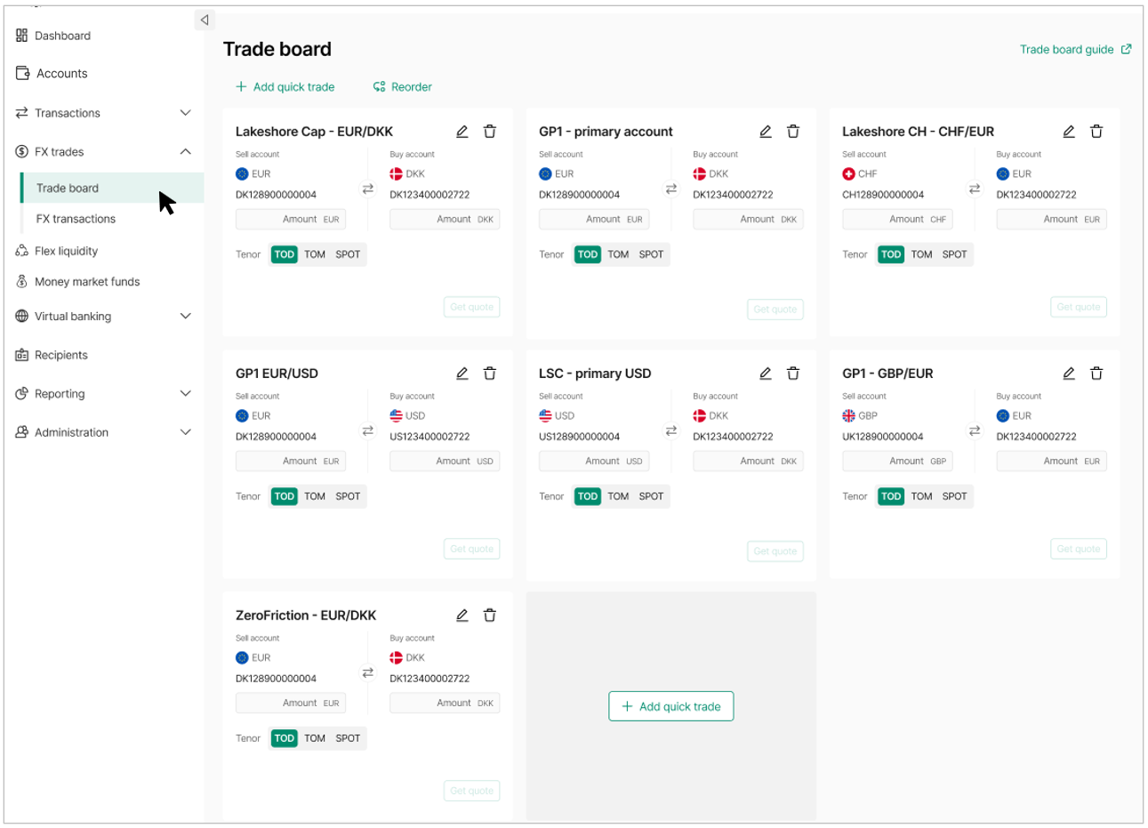 Create a new Quick trade - Click the + Add quick trade button at the top right of your board. Select your sell and buy currency accounts, choose your default tenor (TOD, TOM, or SPOT), and give your Quick trade a name. Click Create quick trade to save it.