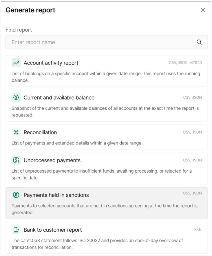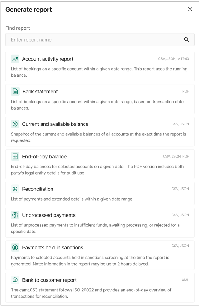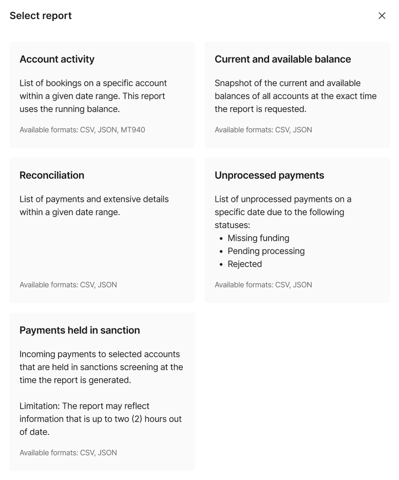 | Account activity | The report provides details of all bookings on a specific account within a given date range. | JSON, CSV, MT940 |