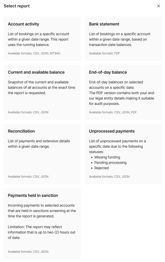 | End-of-day balance | Provides a list of your accounts and their end-of-day balances on a specific date. The PDF version includes our and your company details and can for example be used for audit purposes. | PDF, CSV, JSON |