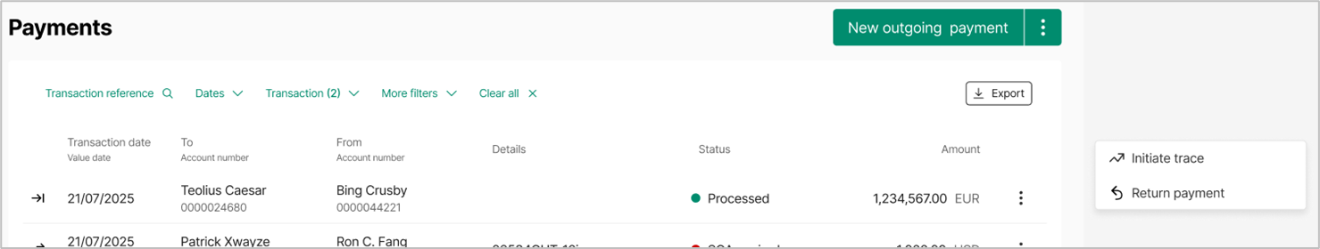 Returning an incoming payment, this service in the Client Portal enables you to initiate a return of an incoming payment directly from your transaction list. For example, if you receive a duplicate payment from a customer or partner, you can quickly initiate a return directly from your transaction list. This process is efficient and ensures all necessary checks and approvals are maintained.